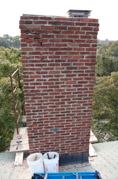 The two original chimneys of this private home in the McIntire Historic District of Salem, MA. were originally built with soft fired brick and lime putty mortar. Soon after the recent repairs performed with Portland cement the chimneys started leaking water into the house ceilings and walls. From a distance the chimneys do not look all too bad however a closer look reveals a different picture.