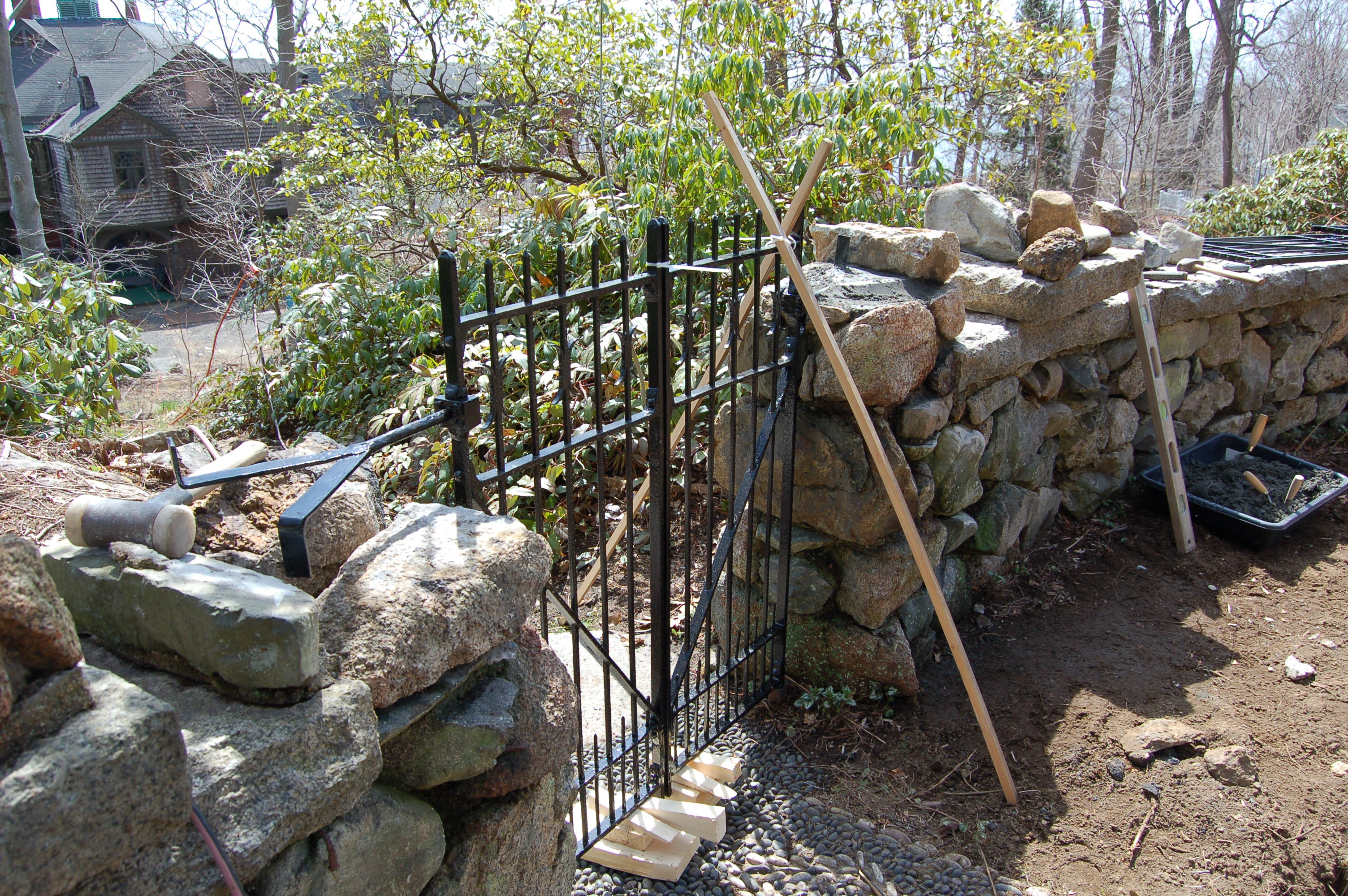 The original gates and arbors are back in place and look great! The blacksmith did a fantastic job at bending everything back to shape, restoring the hinges and painting everything. I was fearful that I would see lots of replaced metal parts or even worse, a bad attempt at reproduction. The fountain is back together and the plumbing is next.