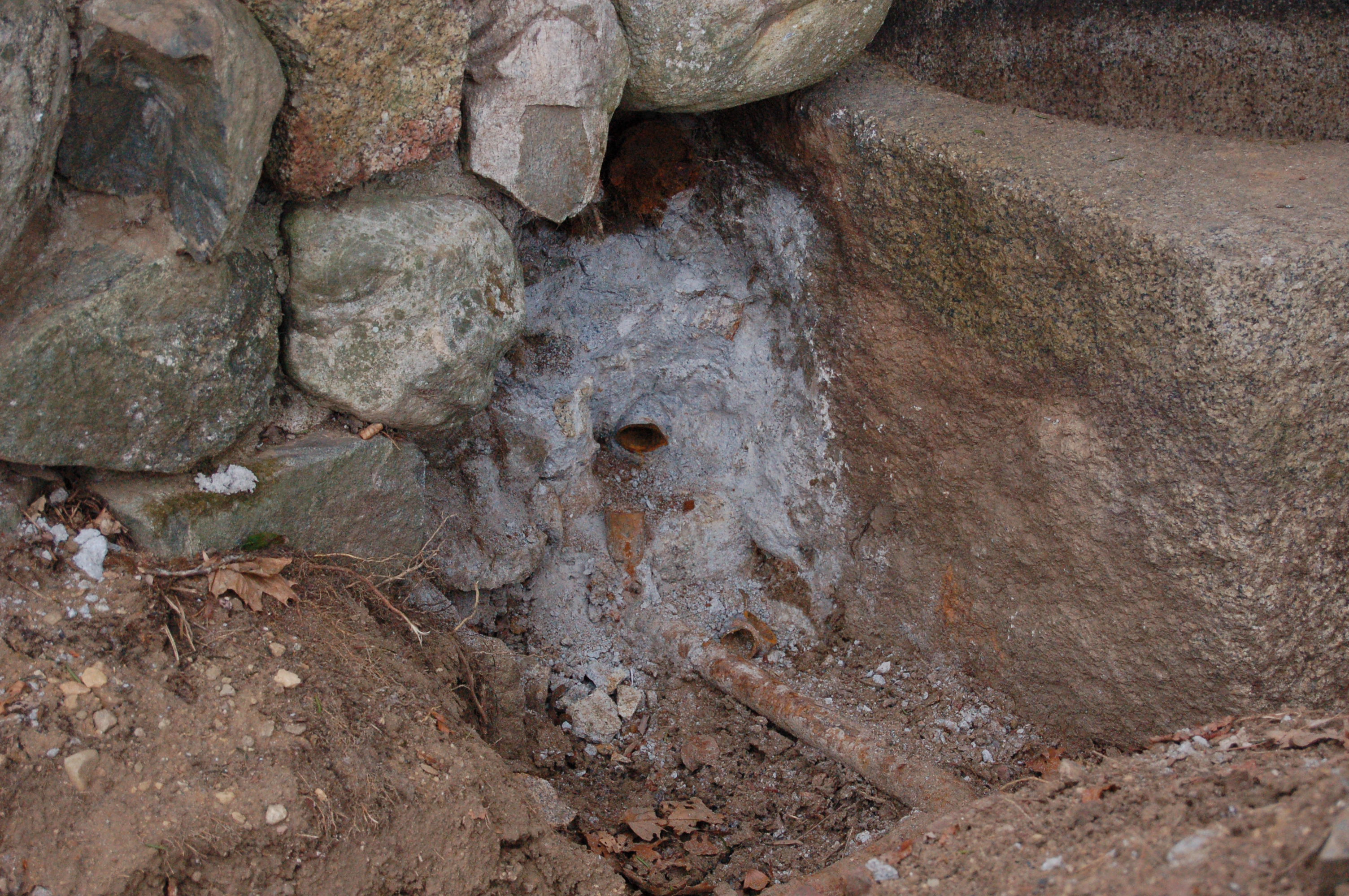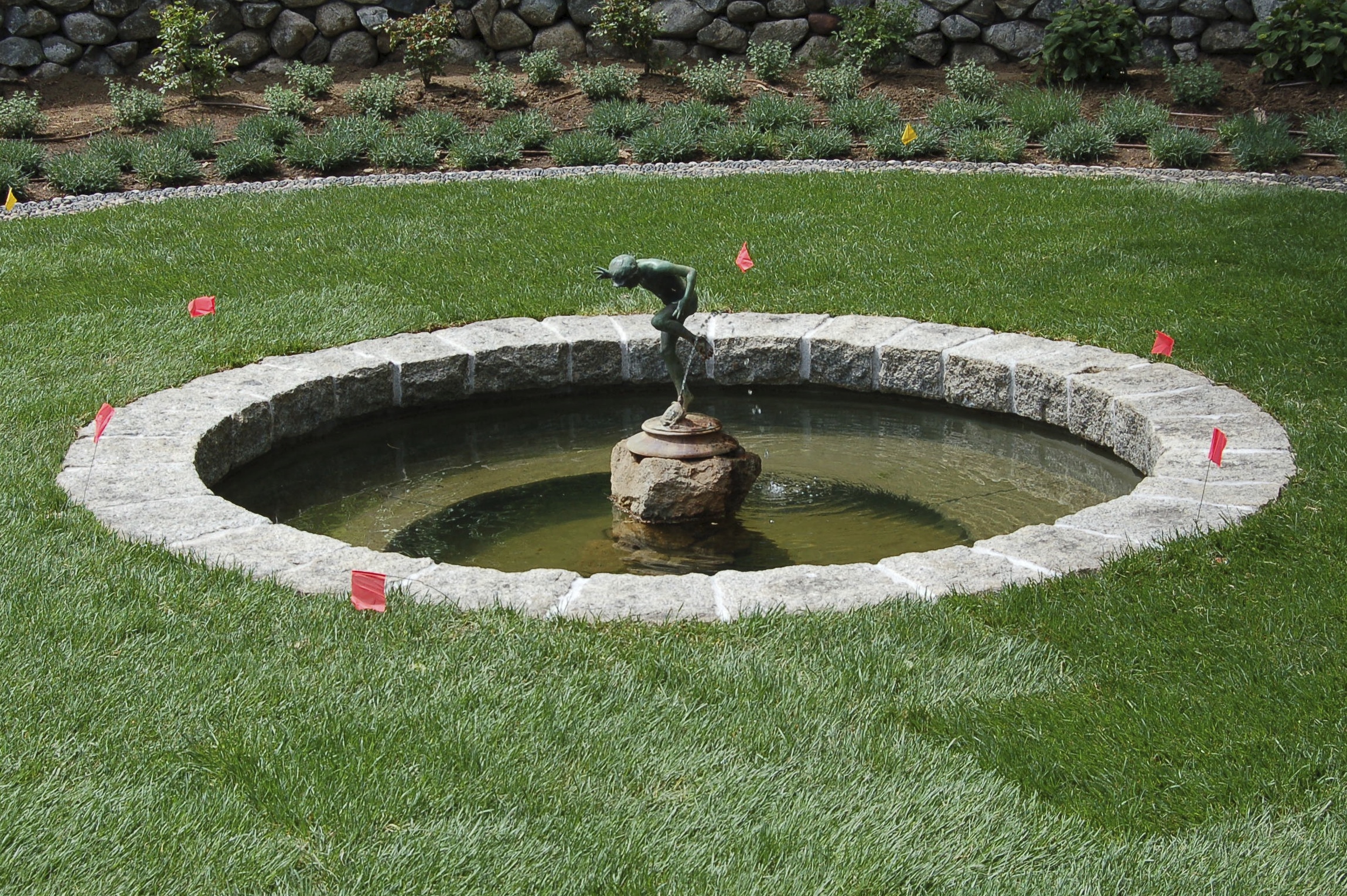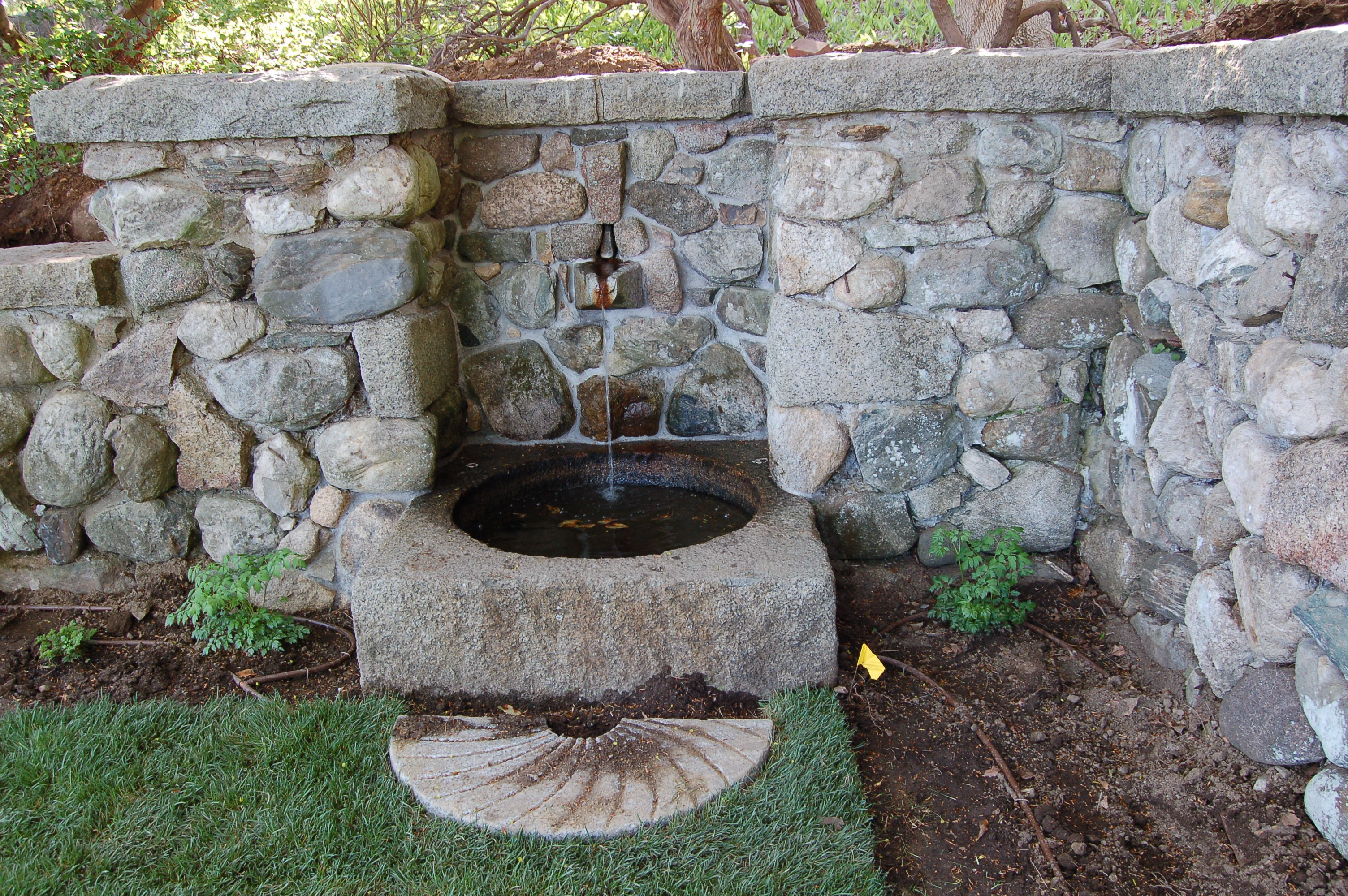 You can see the two heavy granite coping stones barely balancing on top af a wobbly stack of stone at the center. The fountain was plumbed with a continious flow of water as well. This was also converted to a recirculating system.